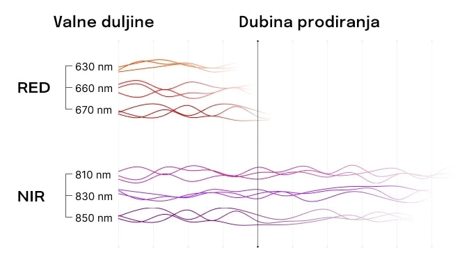 Blisko infracrveno svjetlo, 760–1.400 nm prodire mnogo dublje, dopirući do mišića, kostiju, zglobova i organa.